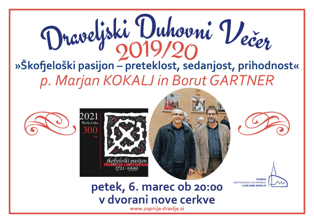Marčevski draveljski duhovni večer bo v duhu skorajšnje 300 letnice prve uprizoritve Škofjeloškega pasijona. Gosta večera bosta dva režiserja Škofjeloškega pasijona: p. Marjan Kokalj in Borut Gartner. Slednji pripravlja tudi pasijon, ki bo izveden naslednje leto v obletnem 300-tem letu. Predavanje nosi naslov: »Škofjeloški pasijon – preteklost, sedanjost, prihodnost«.
