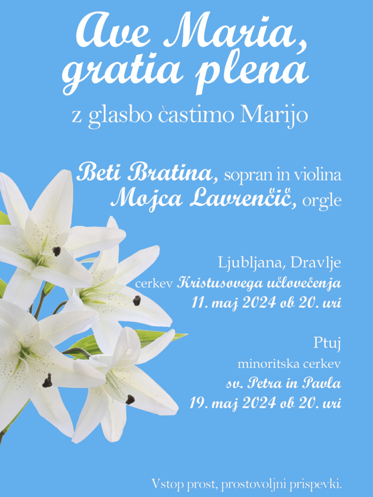 V soboto zvečer ob 20.00 vabljeni na koncert v novo cerkev. Z nami bosta glasbenici Beti Bratina (sopran, violina) in Mojca Lavrenčič (orgle), izvedli pa bosta koncert hvalnic Mariji. Njun program zajema skladbe Verdija, Bacha, Puccinija in drugih mojstrov vokalne glasbe s teksti v latinščini in italijanščini. Koncert bo trajal eno uro, vstop pa je prost.
