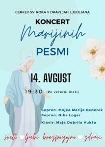 V ČETRTEK, 14. avgusta, bo po večerni sveti maši v novi cerkvi koncert Marijinih pesmi. Nastopili bosta sopranistki Mojca Bedenik in Nika Logar, na klavirju ju bo spremljala Maja Vukša.