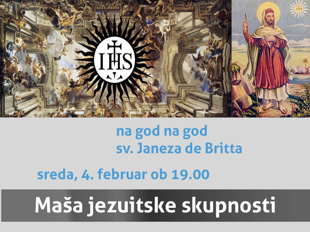 Že vsa leta z vami živi in deluje skupnost Družbe Jezusove. Odločili smo se, da se bomo enkrat mesečno kolikor mogoče vsi zbrali v cerkvi pri sv. maši v edinosti z vami, ki boste tisti večer prišli. Taka maša bo na god enega oziroma izbranega jezuitskega svetnika, ki se ga tisti mesec spominjamo v bogoslužnem koledarju. Praviloma bo to med tednom. V februarju bo ta sveta maša na god portugalskega jezuita in enega izmed prvih jezuitskih misijonarjev v Indiji sv. Janeza de Britta, v sredo, 4. februarja.