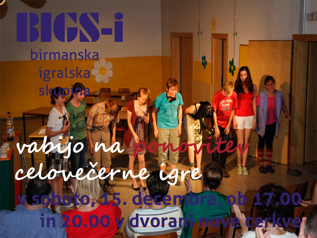 V soboto, 15. decembra, bodo lanskoletni draveljski birmanci, člani skupine BIGS, v dvorani nove cerkve še dvakrat zaigrali igro, ki so jo pripravili ob koncu lanskega veroučnega leta. Igra nima naslova, sestavili so jo večinoma sami, traja pa približno 45 minut. Nanjo ste vabljeni vsi župljani in tudi ostali. Prva predstava bo ob 17.00, druga pa po maši, ob 20.00. Vstopnine ni, so pa prostovoljni prispevki, ki bodo namenjeni za izlet ali drugo aktivnost igralcev.