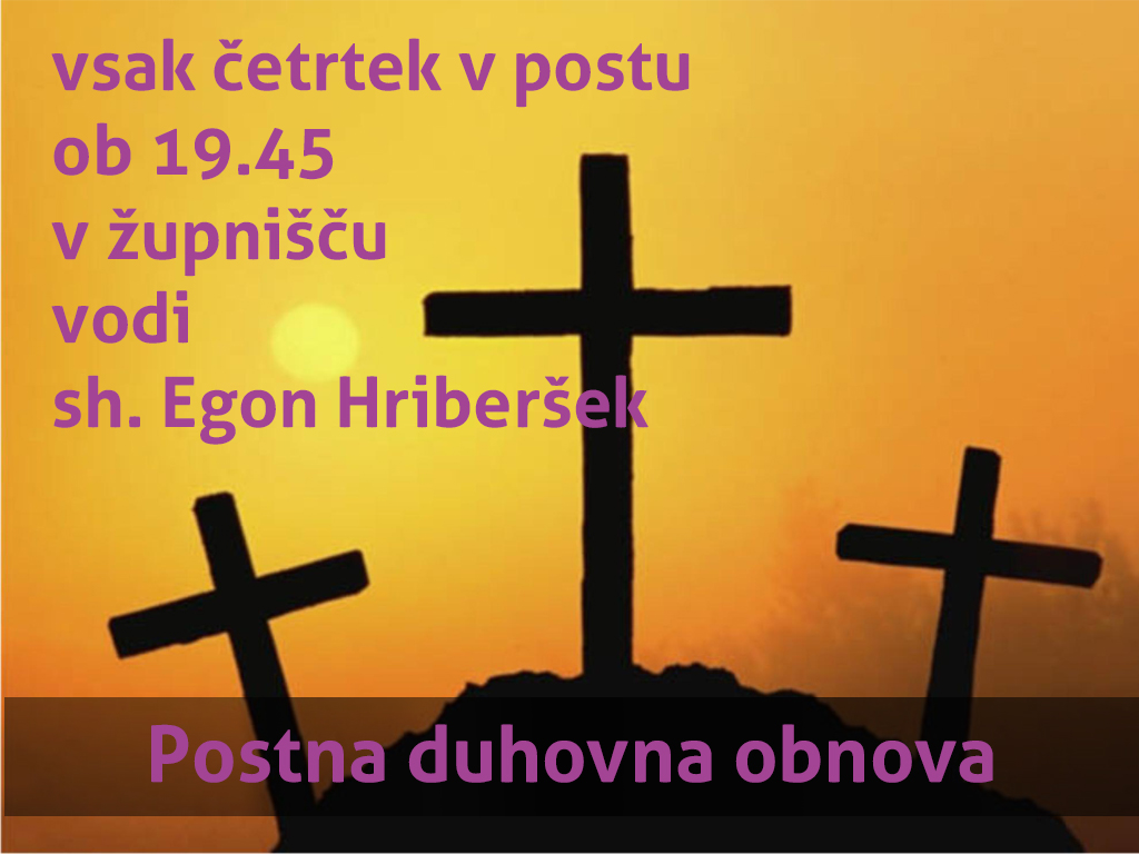 Tudi letos bo v postnem času v naši župniji postna duhovna obnova kot priprava na veliko noč. Vodil jo bo sh. Egon Hriberšek. Srečanja z navodili oz. točkami bodo potekala ob četrtkih po večerni maši ob 19.45 v učilnici župnišča. Zajemala bo 6 srečanj od četrtka 6. marca do četrtka 10. aprila.