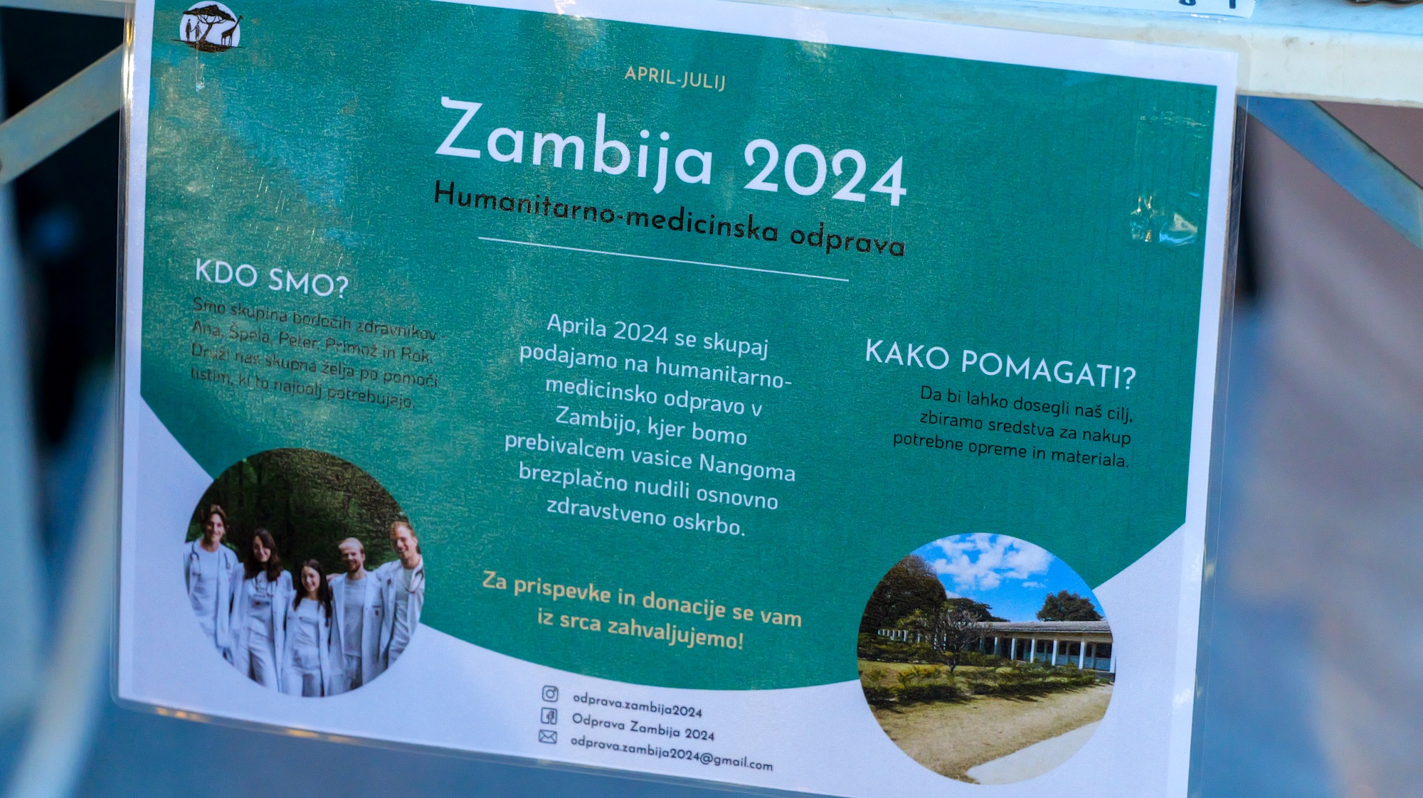 Ker kljub temu, da imamo kot župnija svoje težave in izzive, skušamo vseeno ostajati odprti tudi za tiste ljudi, ki jim gre slabše kot nam, bomo prihodnjo nedeljo dopoldan gostili pet absolventov medicine – to so Ana Janeva, Špela Berič, Rok Štrubelj, Primož Burkat in Peter Janežič. Od aprila 2024 do vključno junija 2024 odhajajo na humanitarno-medicinsko odpravo v naselje Nangoma v Zambiji. Tja se odpravljajo pod okriljem Sekcije za tropsko in potovalno medicino pri Slovenskem zdravniškem društvu.