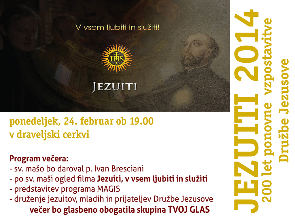V ponedeljek, 24. februarja, bo ob 19.00 v naši cerkvi prireditev z naslovom Jezuiti 2014. Premierno bo predstavljen kratki promocijski film z naslovom: Jezuiti, v vsem ljubiti in služiti. Režiral ga je talentirani mladi režiser David Sipoš, ki je ujel jezuitski utrip na njemu lasten domiseln način. Namen večera bo tudi predstavitev novega jezuitskega bloga z naslovom Jezuitski pogled in pa odlične jezuitske iniciative za mlade z naslovom MAGIS. Naslov večera Jezuiti 2014 je za Družbo Jezusovo zelo pomenljiv, saj letos obhaja dvestoletnico ponovne vzpostavitve Družbe Jezusove. Od 1814 pa do danes so jezuiti naredili kar nekaj pomembnih korakov.
