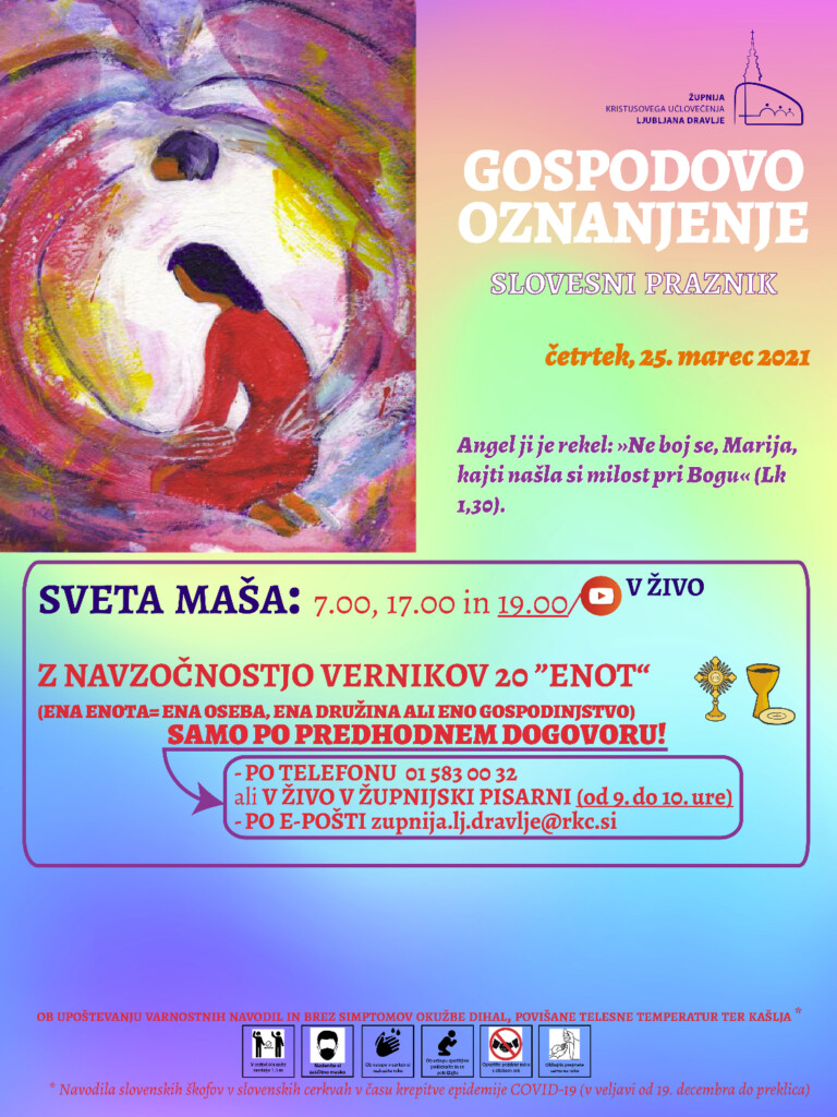 Svete maše v četrtek, 25. 3., bodo ob 7.00, 17.00 in 19.00 (po predhodnem dogovoru).