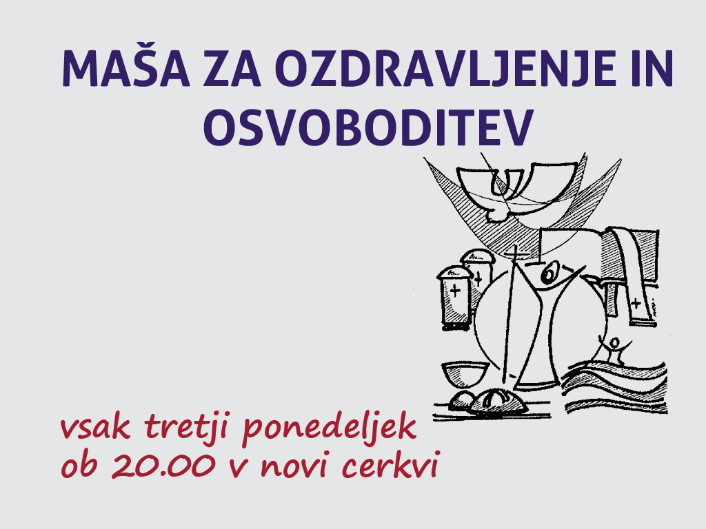 Sveta maša za ozdravljenje in osvoboditev: vsak tretji ponedeljek v mesecu s pričetkom ob 20.00 (19.45 slavljenje), Mašo bo daroval p. Mio Kekić. Po maši je blagoslov z Najsvetejšim in molitev nad posamezniki.