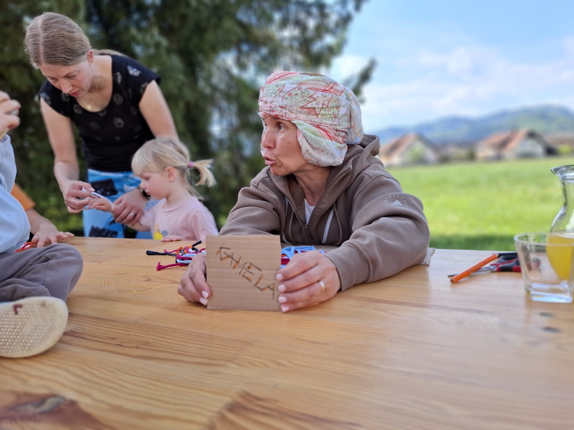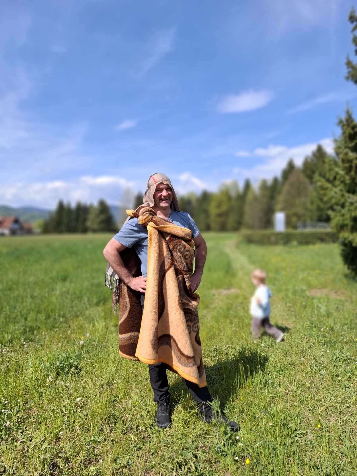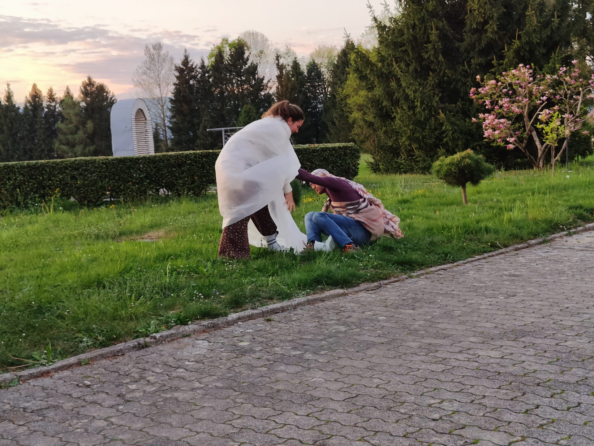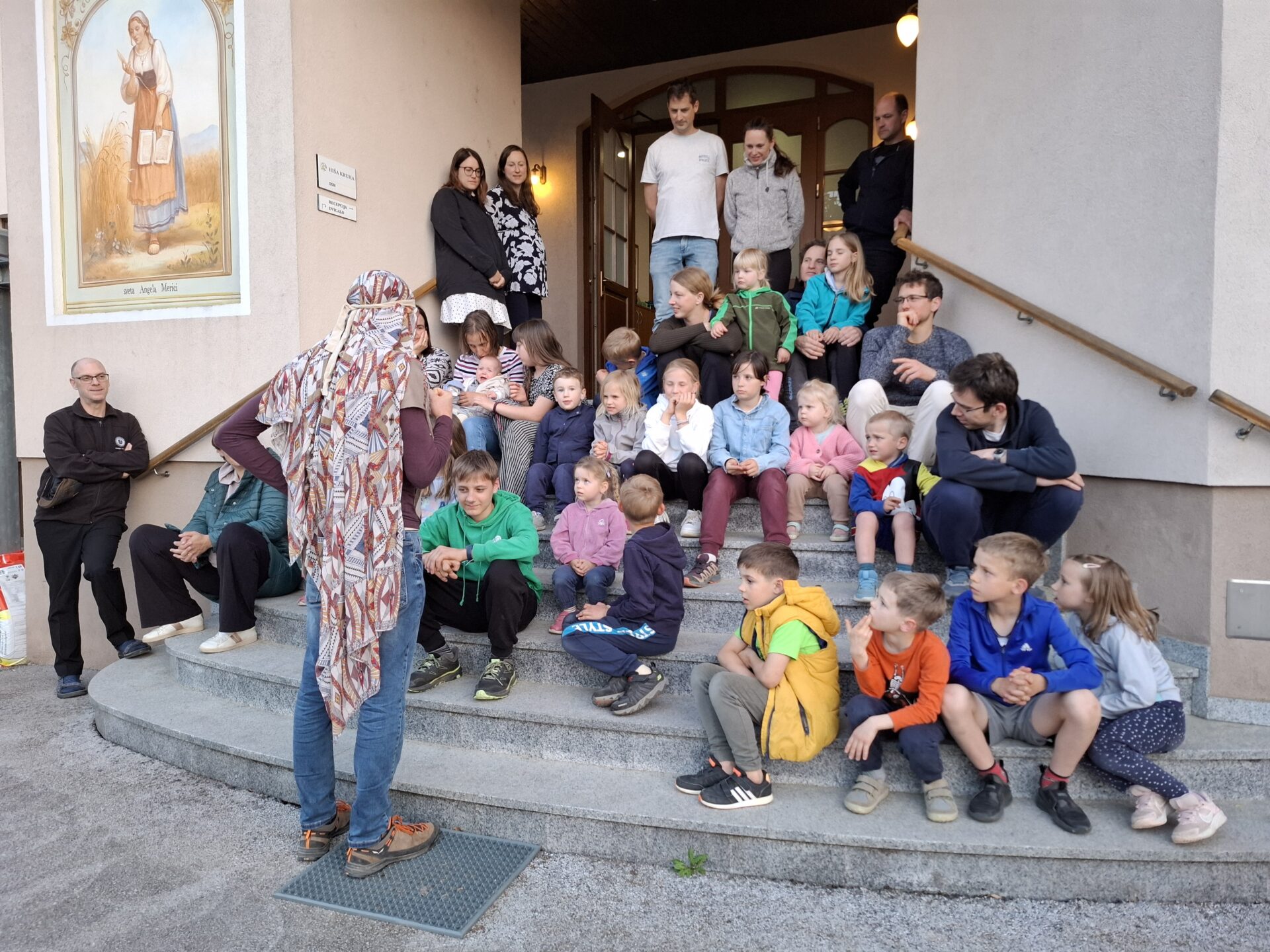 Razgreti od sonca in polni vtisov smo se (vsaj malo) umirili pri sveti maši, po večerji pa nas je čakalo prav posebno presenečenje: zaigran odlomek Jakobovega boja z Bogom/angelom (1 Mz 32,23-33). Tokrat je v vlogi Jakoba blestel Matic in zaigrano se je otrok močno dotaknilo. Po večerni molitvi so šli otroci spat … Starši pa smo se zbrali ob pričevanju Jerneje in Aleša, ki sta spregovorila o odpuščanju.