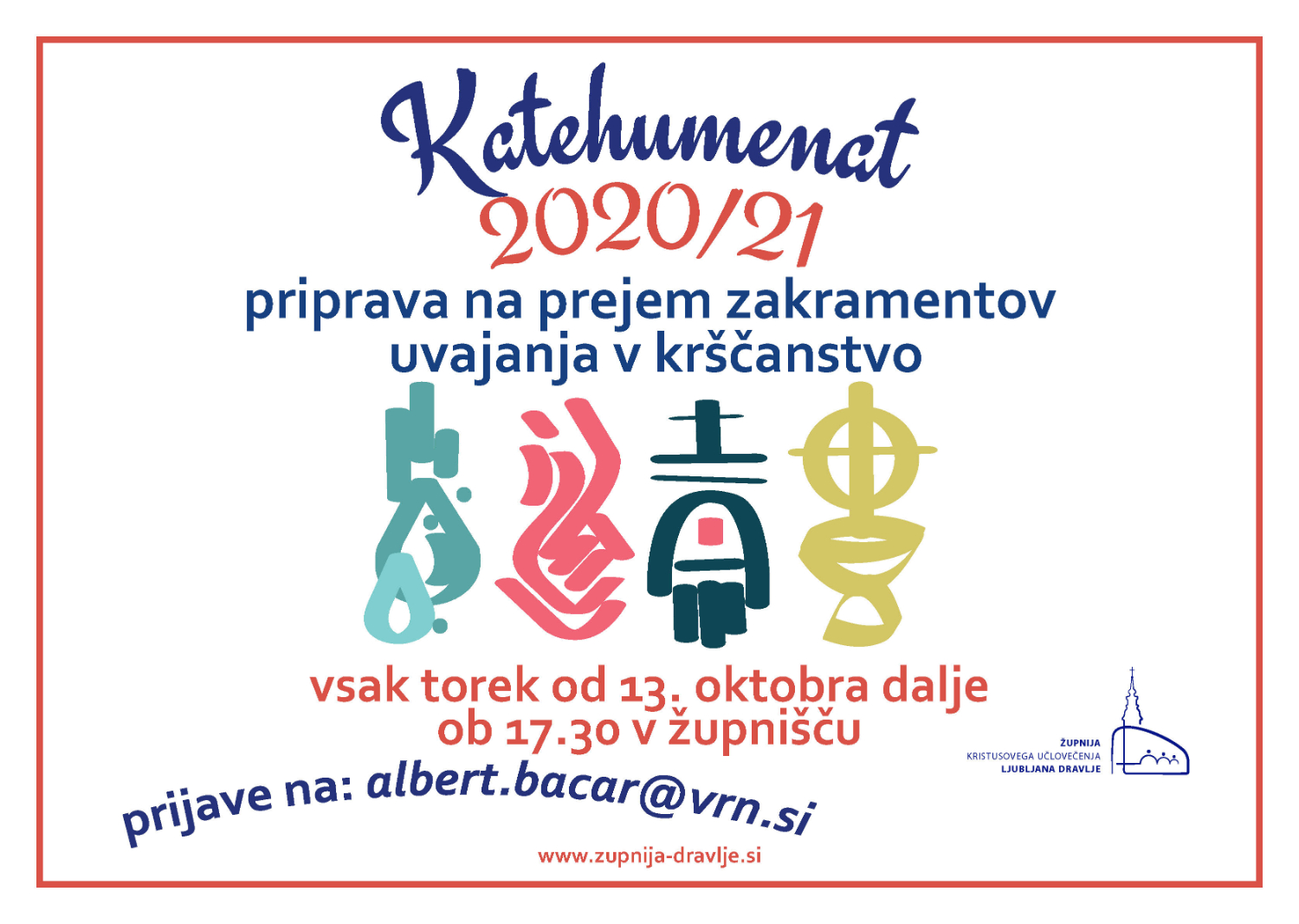 Katehumenat se v naši župniji začenja v torek, 13. oktobra. Prvo srečanje bo ob 17.30 v veroučni učilnici. Letos bo pripravo odraslih na zakramente uvajanja vodil p. Albert Bačar, dosegljiv na elektronski naslov albert.bacar@vrn.si.