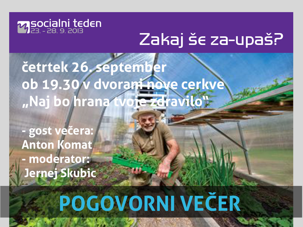 Pogovor bo potekal o hrani, prehrani, samooskrbi ter sistemu, ki nas od tega odvrača in zapeljuje na pota bolezni. V upanju, da jemo zdravo, se nam lahko zgodi tudi to, da se od neprimerne zdrave prehrane začnemo rediti. Kakšna je zdrava hrana in kakšne so pogoste zmote pri njenem uživanju? Kaj lahko stori vsak posameznik, da ohrani zdravje in vitalnost? Dotaknili se bomo sodobnega načina prehranjevanja, GSO, pogledali pot, ki jo hrana prepotuje od proizvajalca do kupca in se pogovorili o zaupanju v posamezen člen te verige.