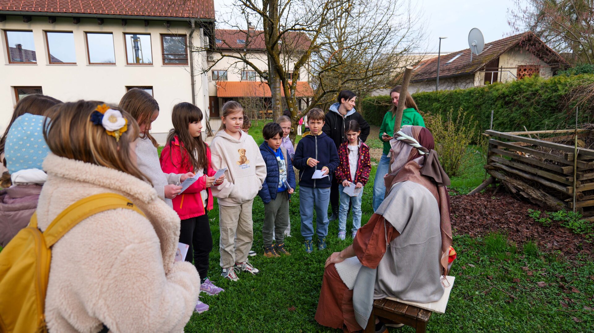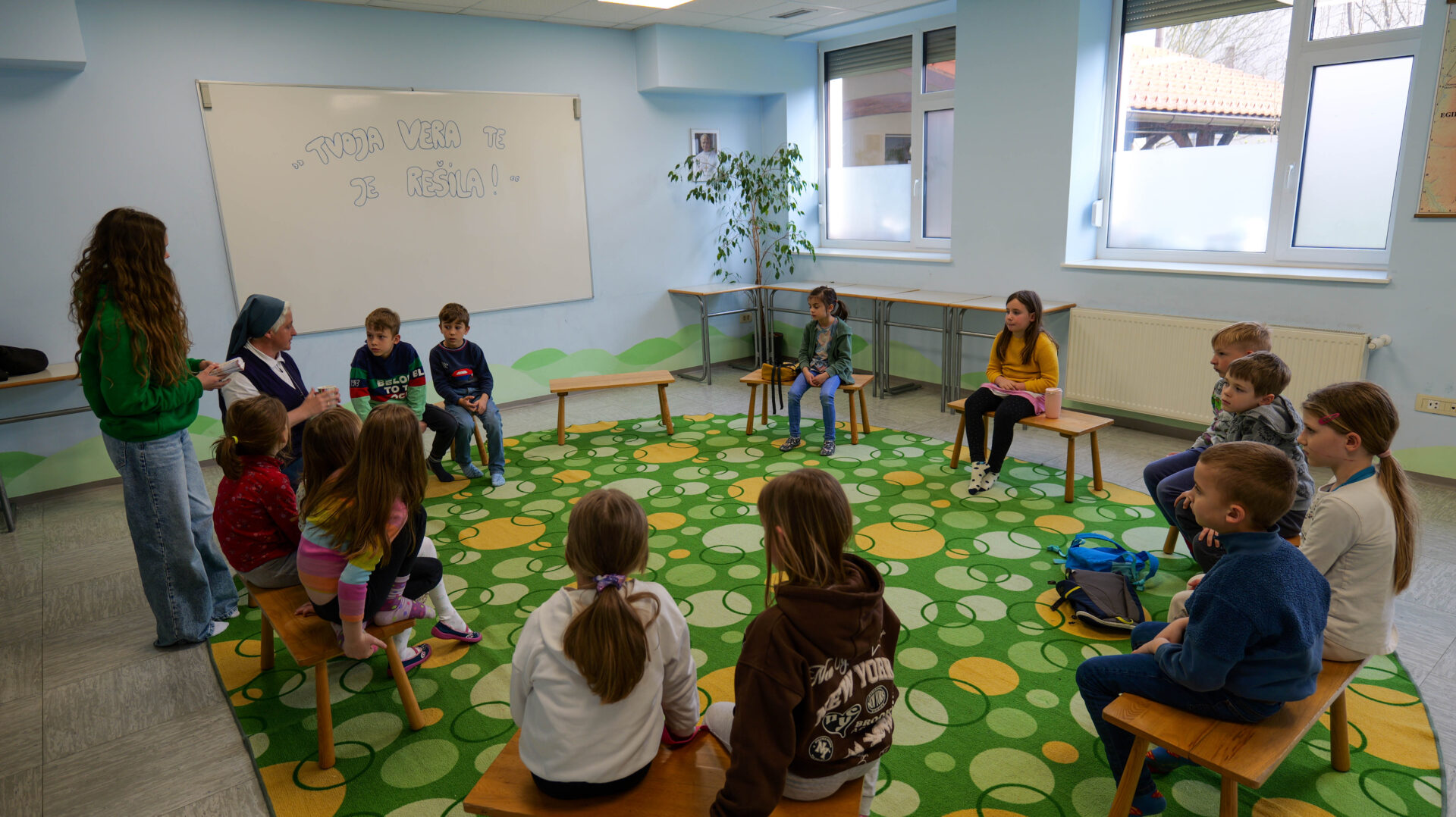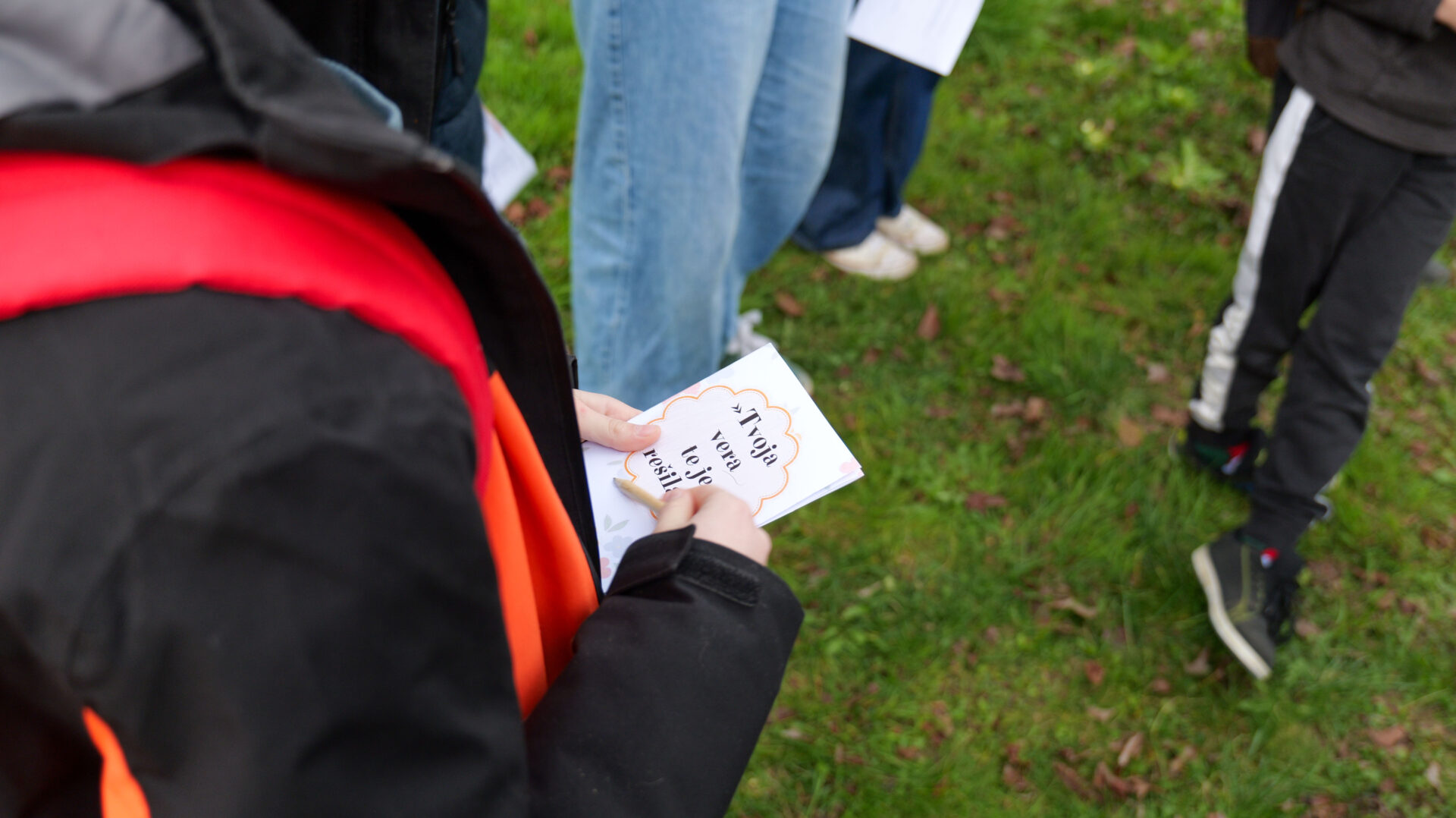 Šolski otroci so imeli najprej kratko katehezo s katehistinjami: 1. in 2. razred s s. Sabino, 3. in 4. razred s Katjo, 5. in 6. razred z Nežo ter 7. in 8. razred z Zarjo. Pogovarjali so se o tem, kaj pomeni rešiti, spoznali so, kakšna je razlika med verjeti in verovati… Nato se je vsaka skupina ustavila na štirih točkah. Na treh točkah so spoznali svetopisemske osebe, ki jim je Jezus rekel: “Tvoja vera te je rešila!”