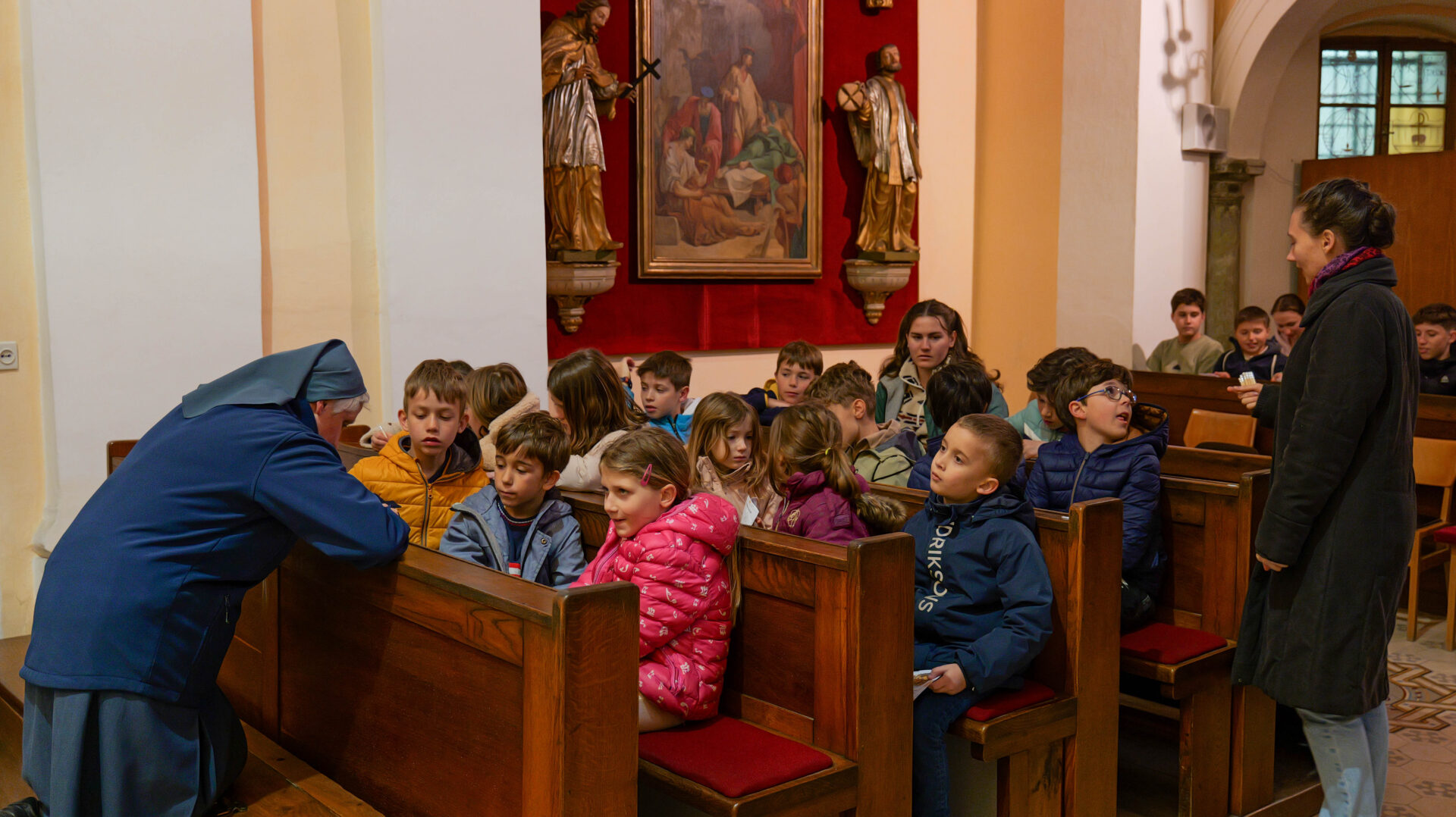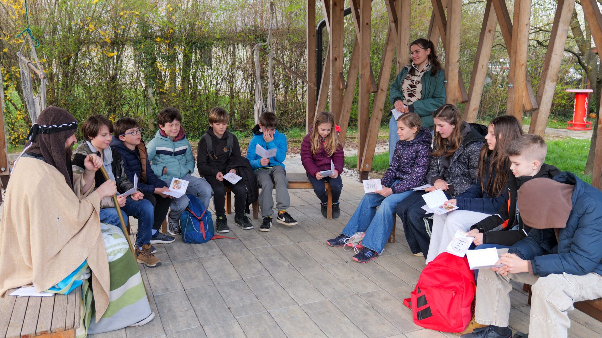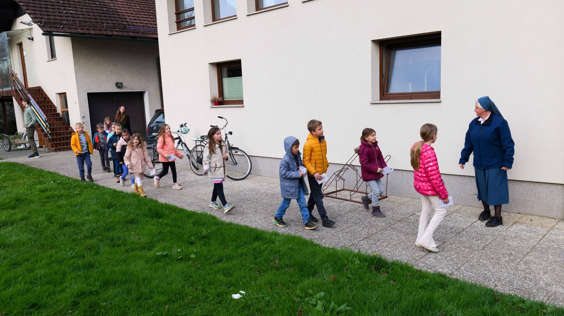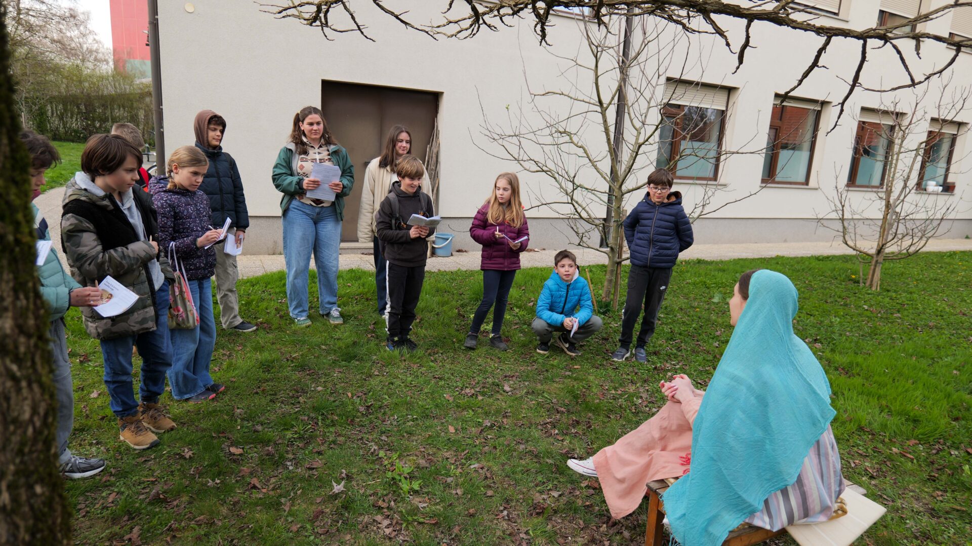 Šolski otroci so imeli najprej kratko katehezo s katehistinjami: 1. in 2. razred s s. Sabino, 3. in 4. razred s Katjo, 5. in 6. razred z Nežo ter 7. in 8. razred z Zarjo. Pogovarjali so se o tem, kaj pomeni rešiti, spoznali so, kakšna je razlika med verjeti in verovati… Nato se je vsaka skupina ustavila na štirih točkah. Na treh točkah so spoznali svetopisemske osebe, ki jim je Jezus rekel: “Tvoja vera te je rešila!”