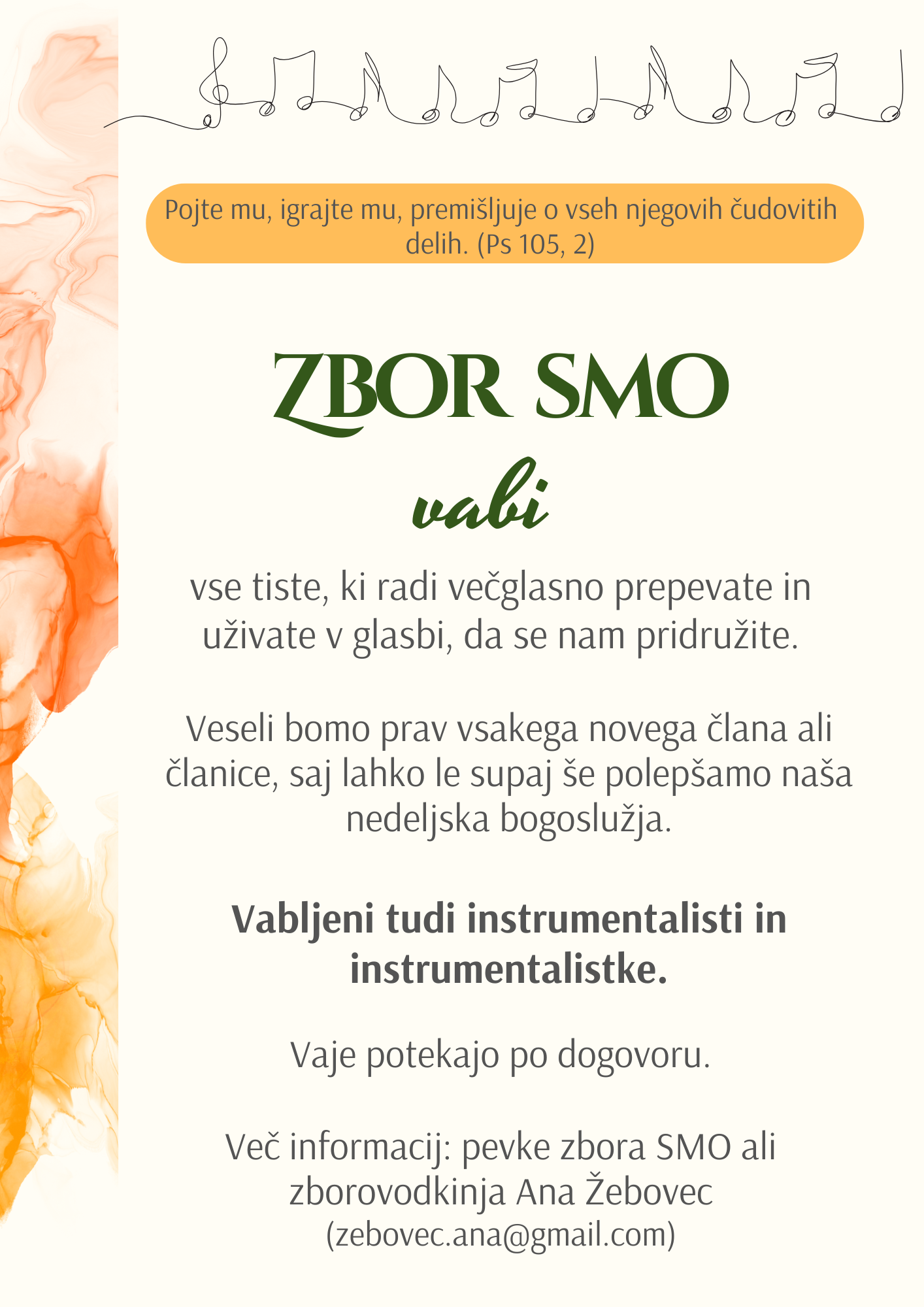 Vabljeni tudi inštrumentalisti/ inštrumentalistke, ki bi vas zanimalo spremljanje zbora ob nedeljskih bogoslužjih, ob 8.30 ali drugih priložnostih.